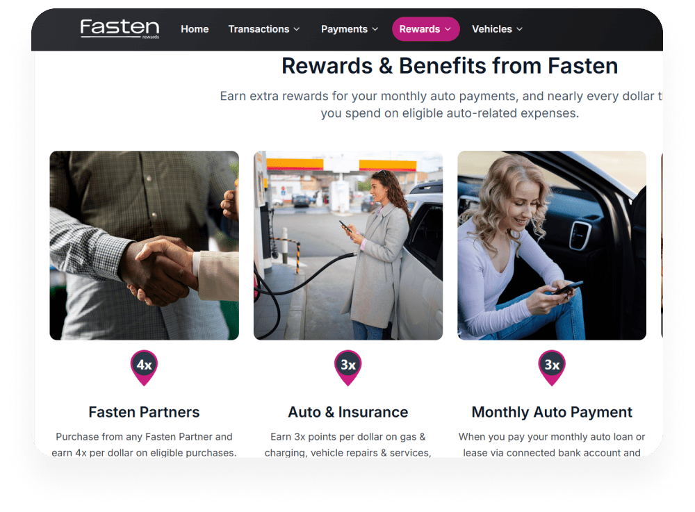 Fasten is a U.S.-based auto-rewards fintech empowering drivers to transform everyday vehicle expenses into valuable rewards through a tailored Visa credit card. Users earn boosted points on auto loans, gas, insurance, EV charging, and maintenance, and redeem them for travel, statement credits, and exclusive partner perks—all within an intuitive digital experience